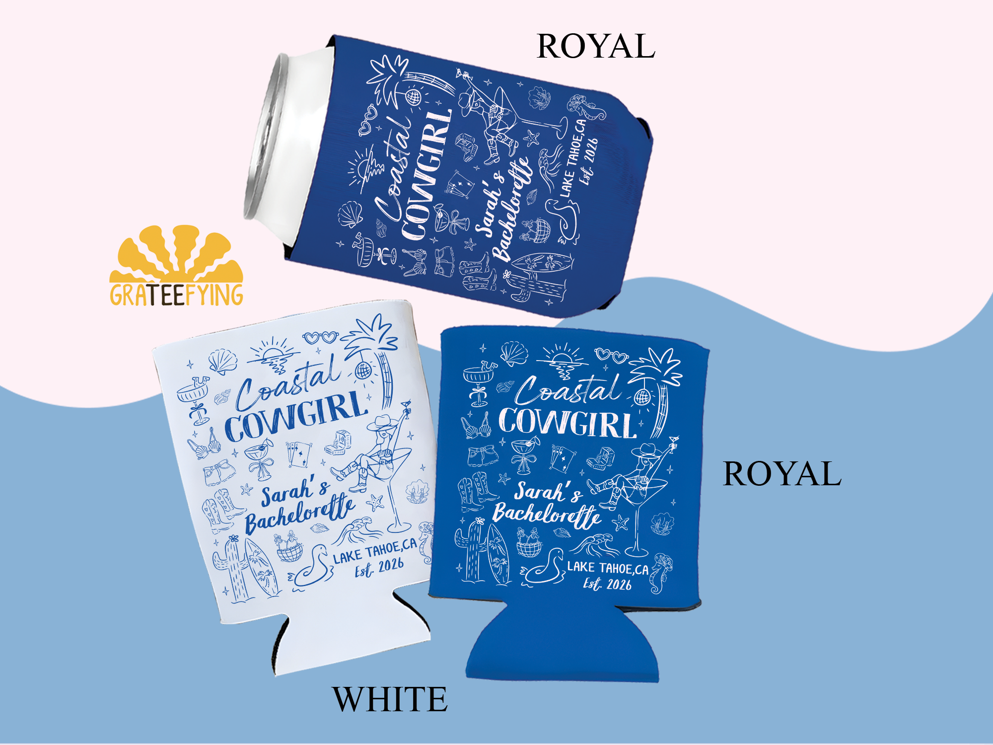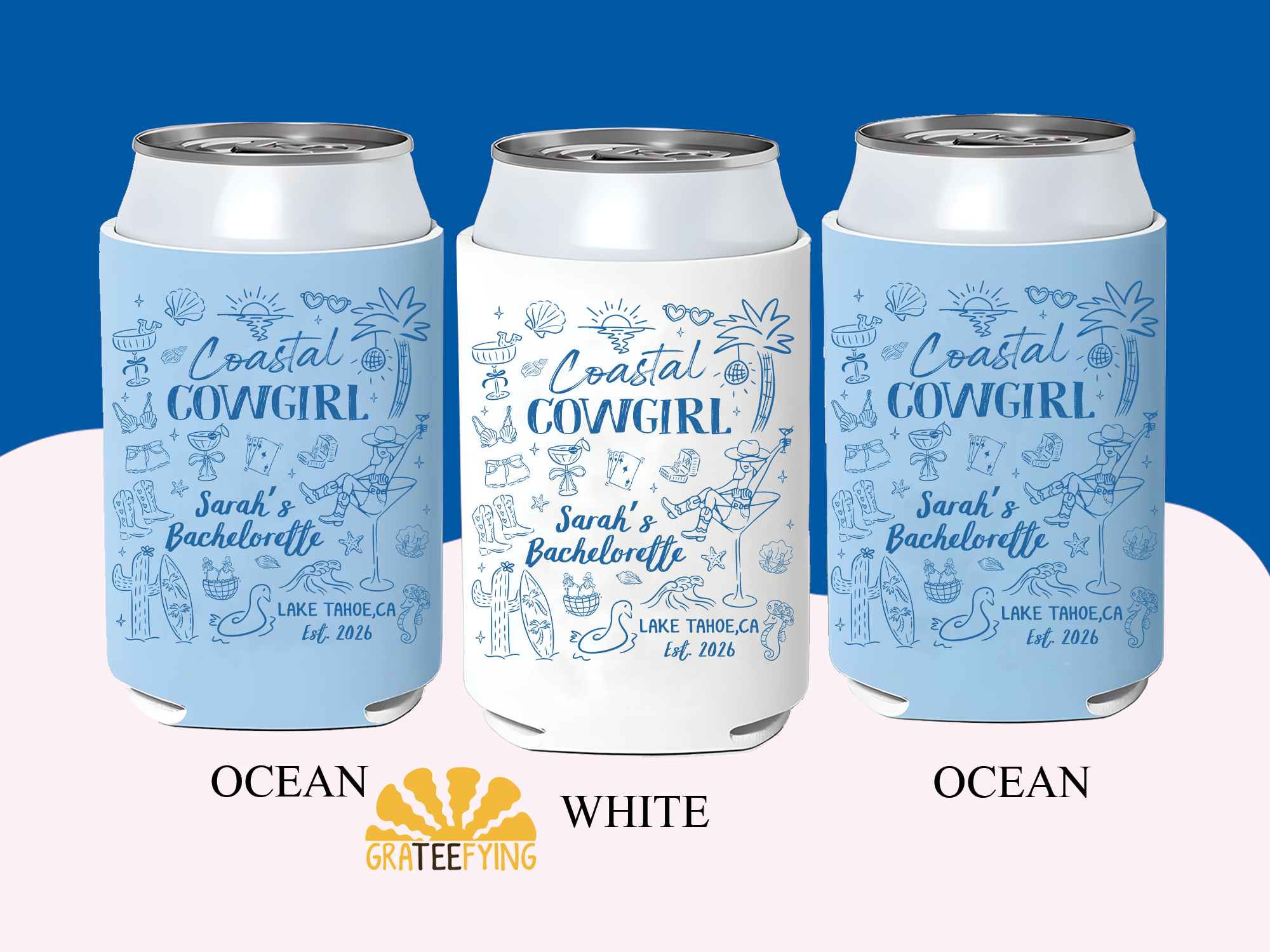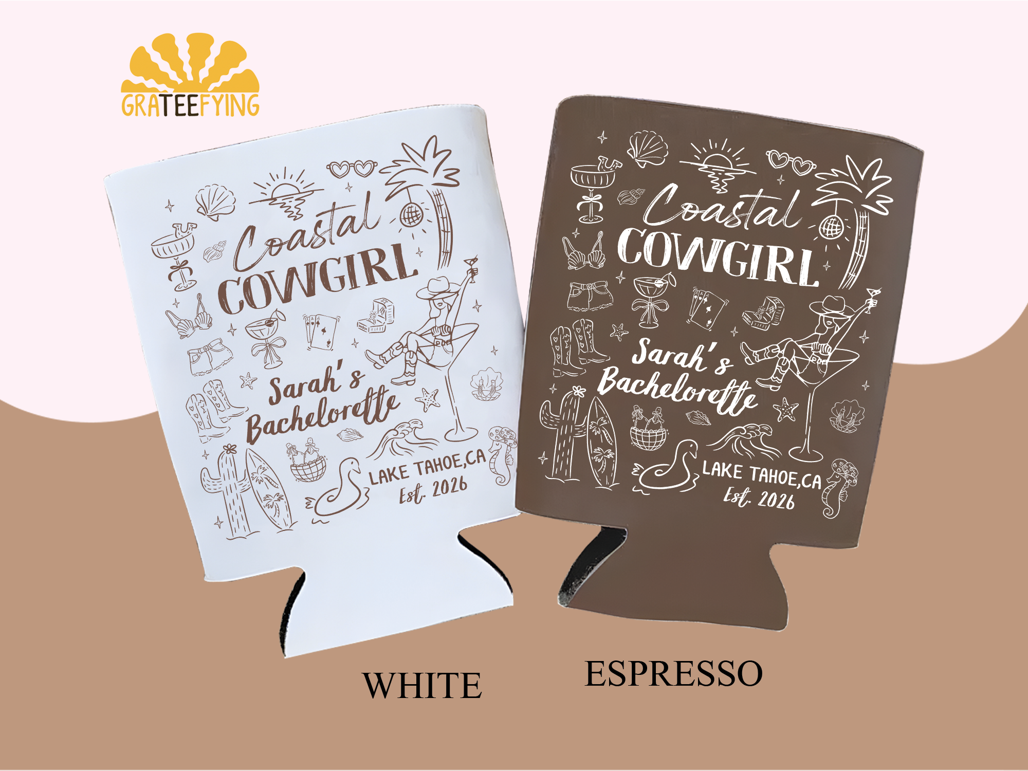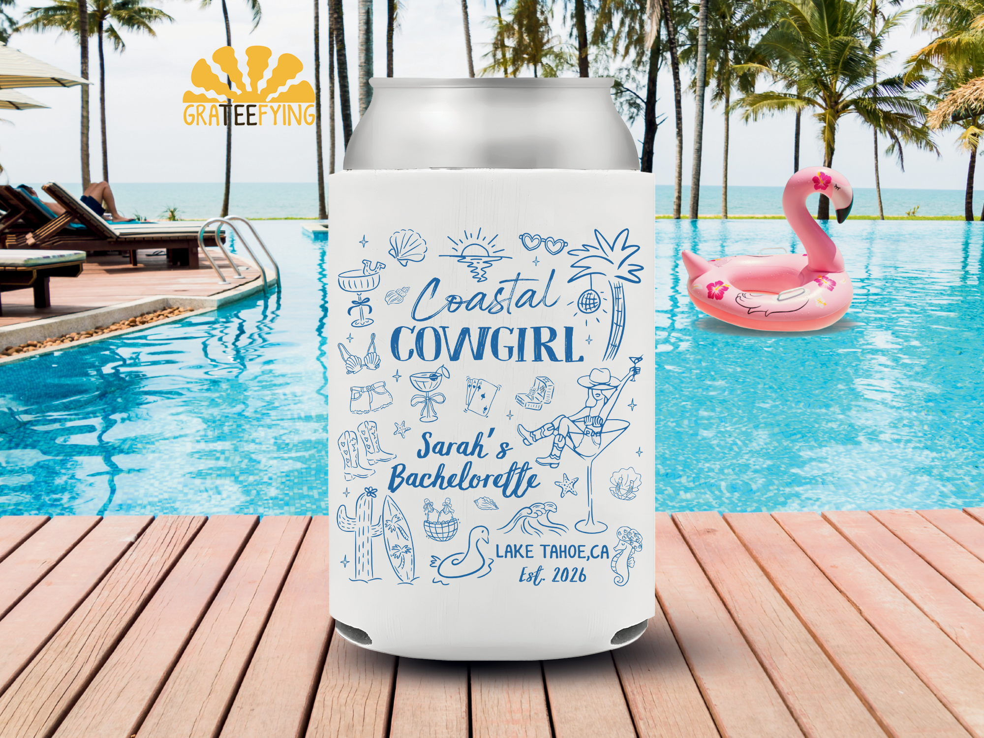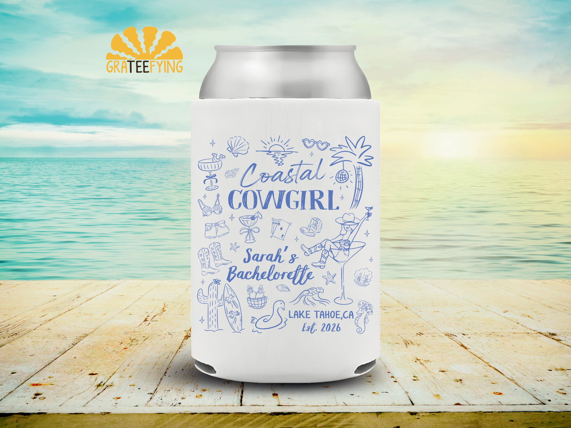 The Stunning Coastal Cowgirl Bachelorette Can Cooler is perfect for any cowgirl bachelorette weekend by the beach. Designed for sunny celebrations and unforgettable girls’ trips, this stylish can sleeve keeps drinks icy while adding the perfect western-meets-coastal vibe to your party.
