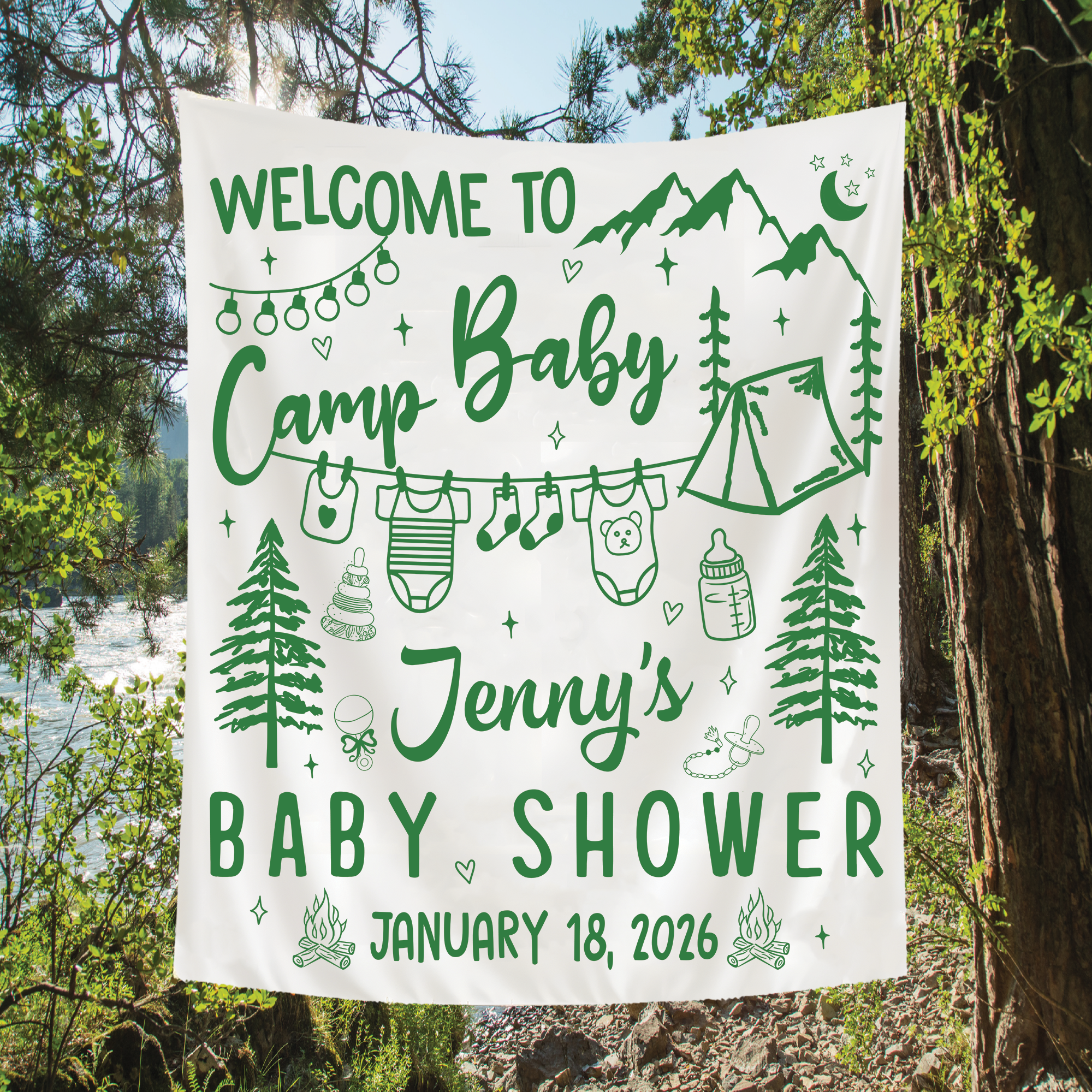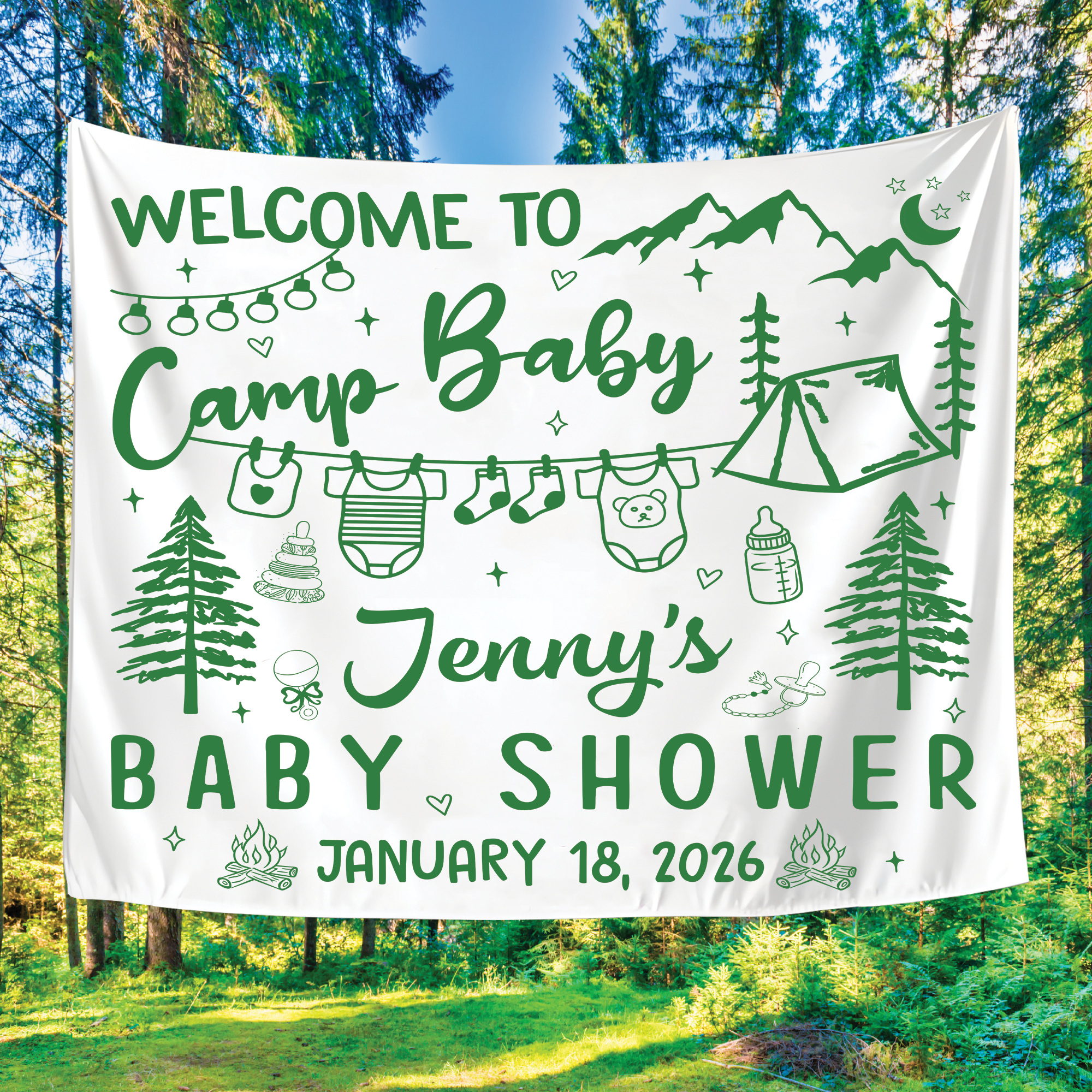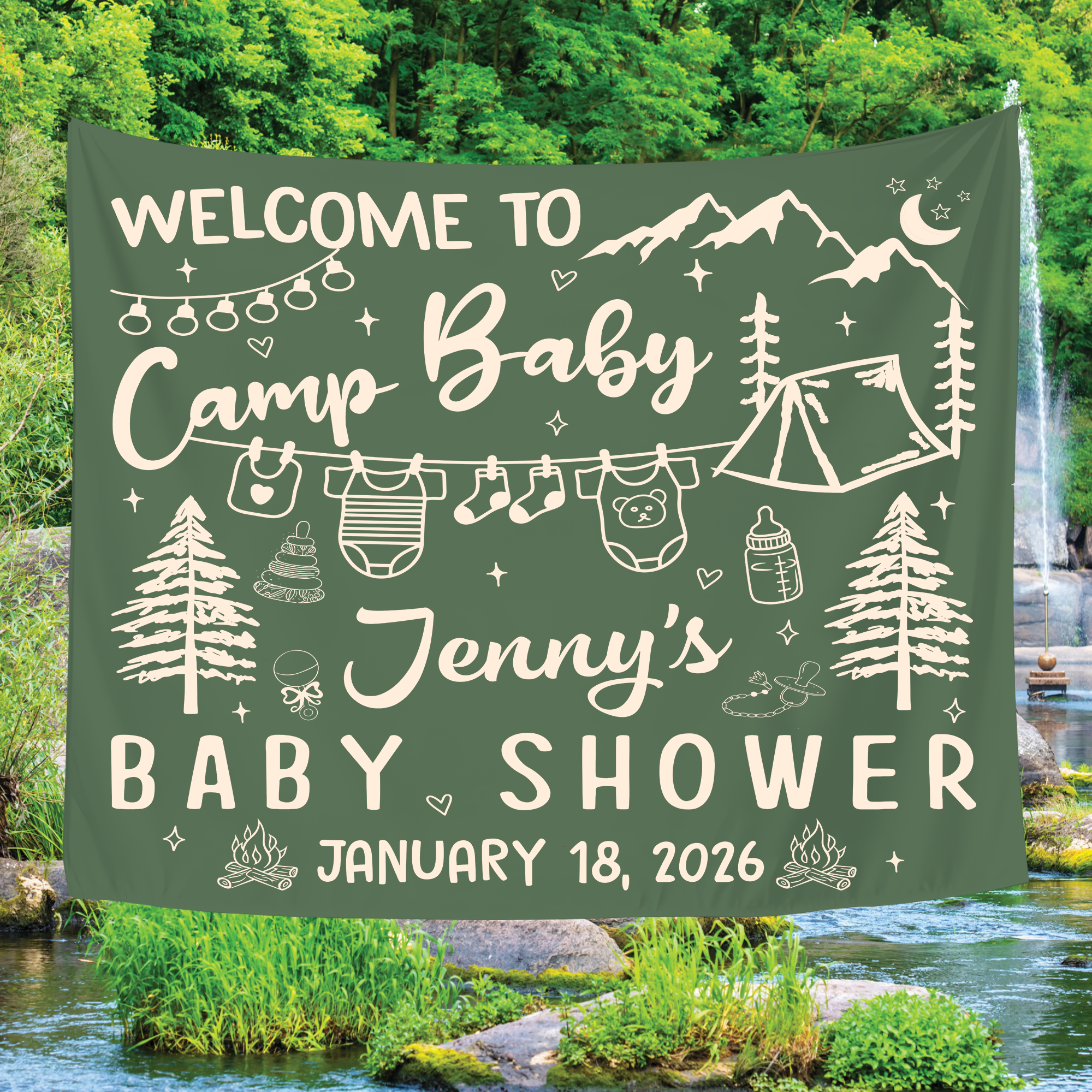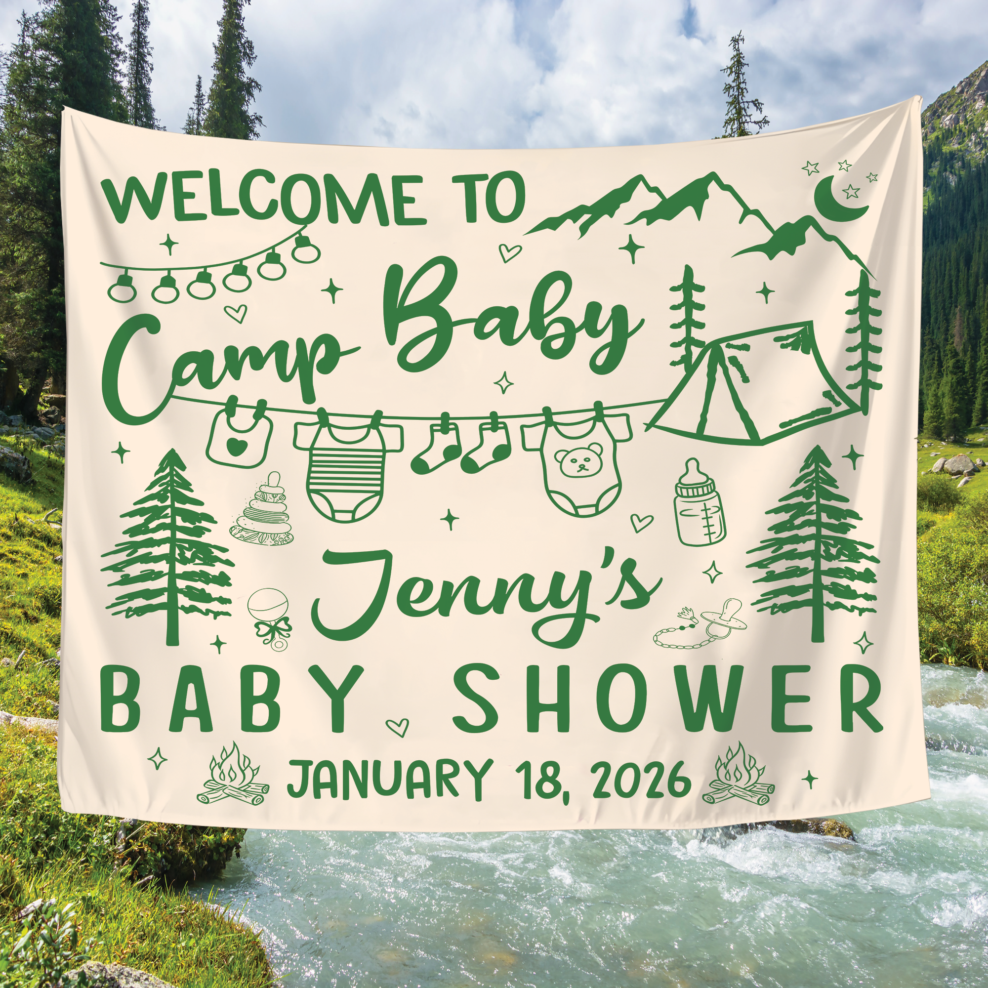 Perfect as a baby shower backdrop, personalized baby shower banner, or statement baby shower photo backdrop, this design creates the ideal setting for capturing heartwarming moments with family and friends. Whether you’re celebrating a baby girl, baby boy, or hosting a neutral-themed shower, this custom baby shower tapestry adds a meaningful and memorable touch to any space.
