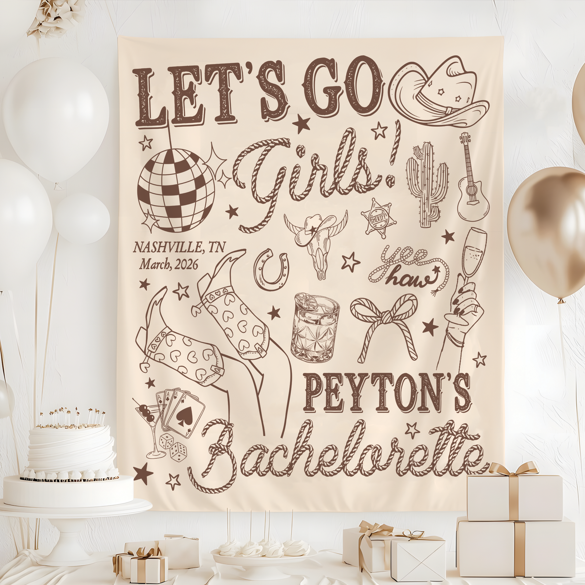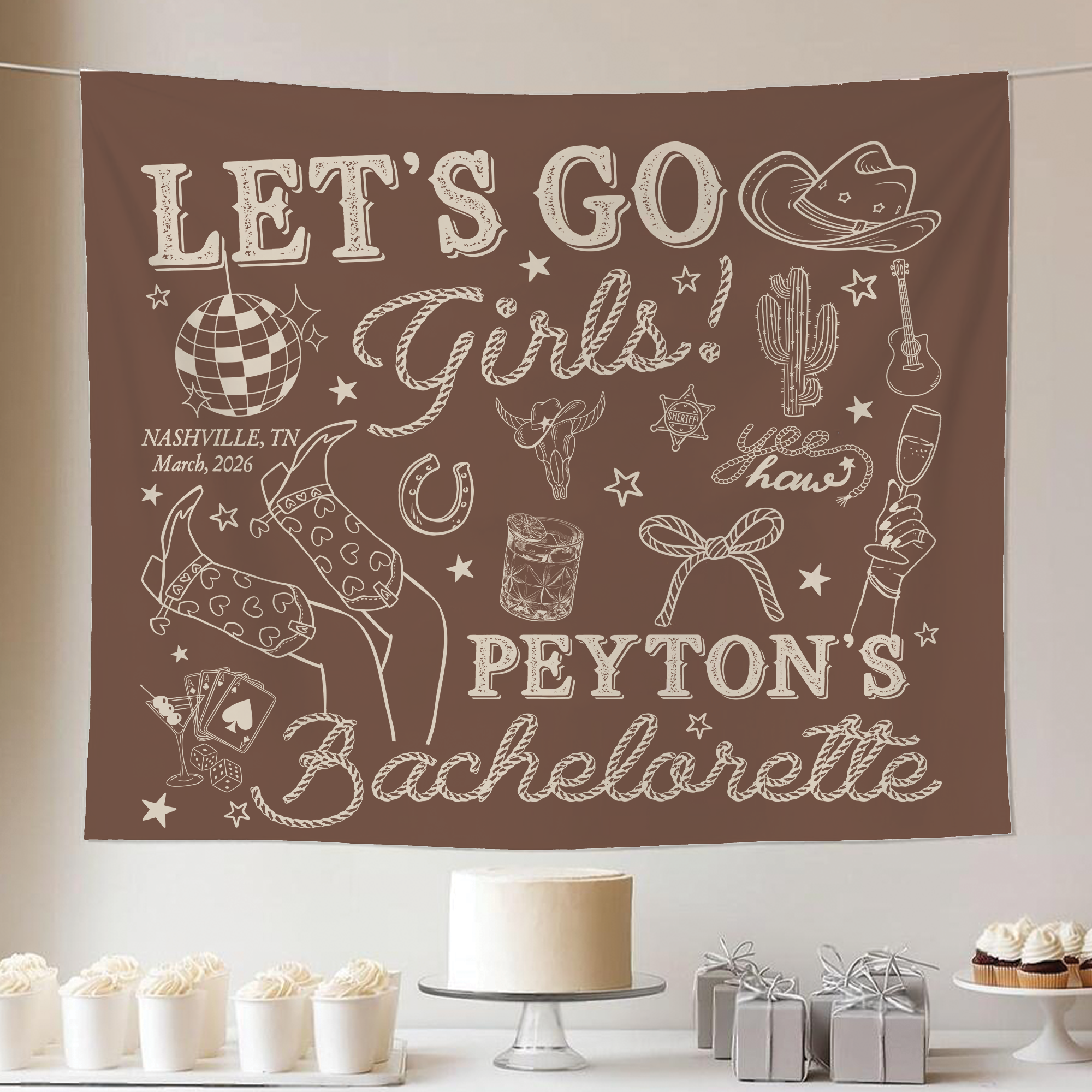 Bachelorette Party Tapestry becomes instantly unforgettable with this custom wall tapestry, designed as a stylish custom backdrop for bridal showers, and pre-wedding parties. Fun, eye-catching, and full of personality, this tapestry sets the vibe and elevates your party décor effortlessly.